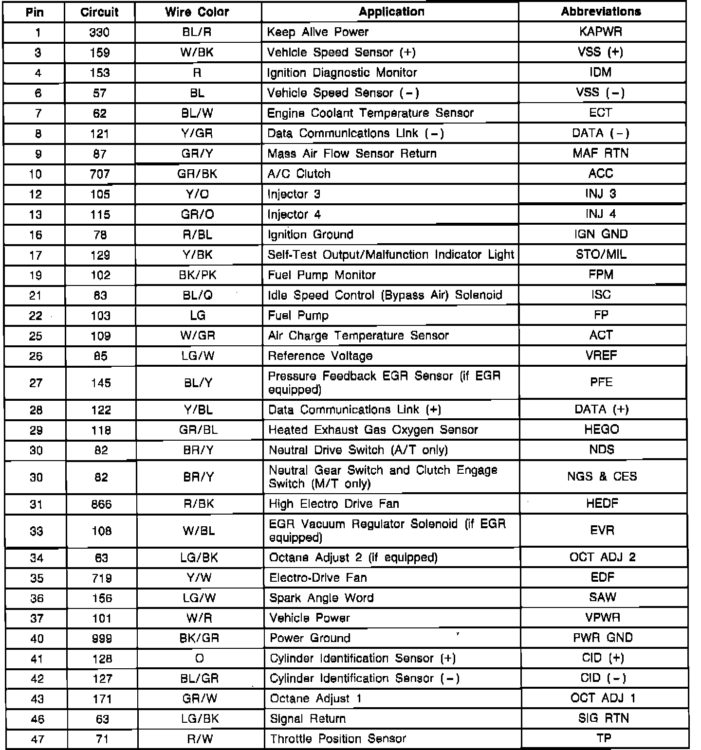 Electronic Control Assembly (ECA) Pinout Chart: