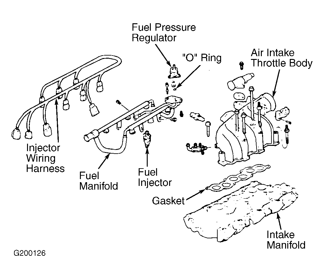 - Disconnect wiring harness at fuel injectors. See Figure. Disconnect vacuum hose from fuel pressure regulator. Remove fuel assembly manifold bolts (2 on each side). Carefully disengage fuel supply manifold from fuel injectors by lifting and gently rocking rail.