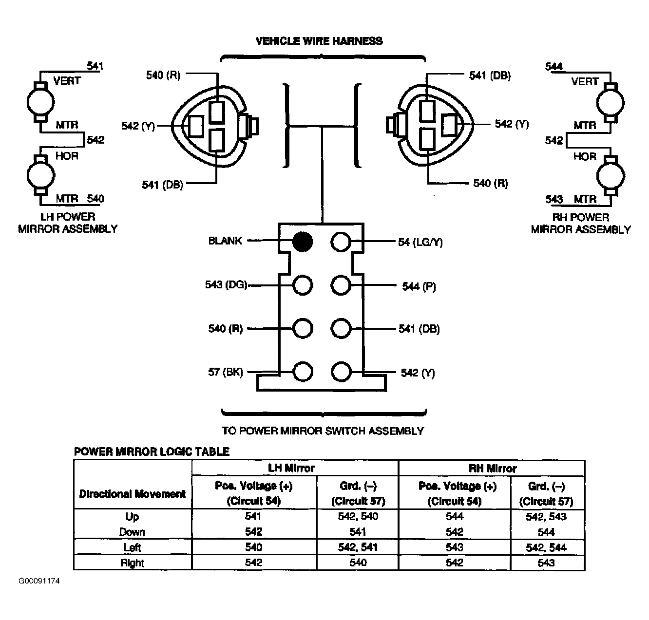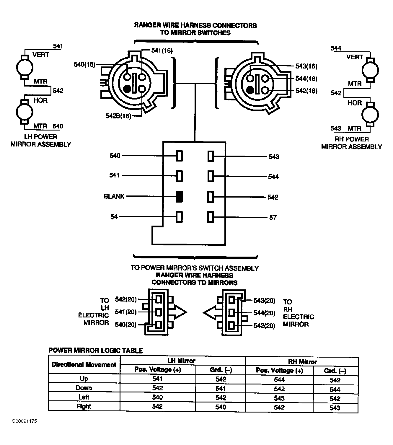- Using Rotunda Digital Volt-Ohmmeter 007-00001 or equivalent, verify circuit logic at switch connector. See Figure or Figure . Is circuit logic okay at outside rear view mirror control? If yes, trace along outside mirror control wiring to determine where cross circuitry took place. Service as required. If no, replace outside rear view mirror control and retest mirror operation.