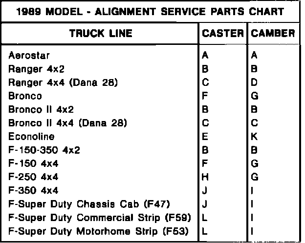 Refer to the appropriate Light Truck Shop Manual for service details. The following Alignment Service Parts Charts provide correct parts usage for each type of vehicle. Select the appropriate parts group from these charts and use the Caster/Camber Parts Information Chart to order the parts required.