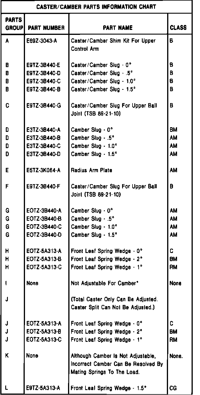 ACTION: If Light Truck Shop Manual diagnostics indicate the need for front alignment adjustment, use the following caster/camber adjustment parts and alignment specifications.