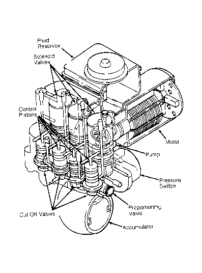 The hydraulic control unit contains a high pressure gas actuator assembly, an electric pump to provide pressure to hydraulic system for ABS operation, solenoid and cut-off valves to modulate brake hydraulic pressure at each wheel, a pressure switch, proportioning valve and fluid reservoir. The internal electric pump supplies pressure for ABS system to reapply or increase hydraulic pressure as required for maximum braking without wheel lock-up. See Fig 1 .