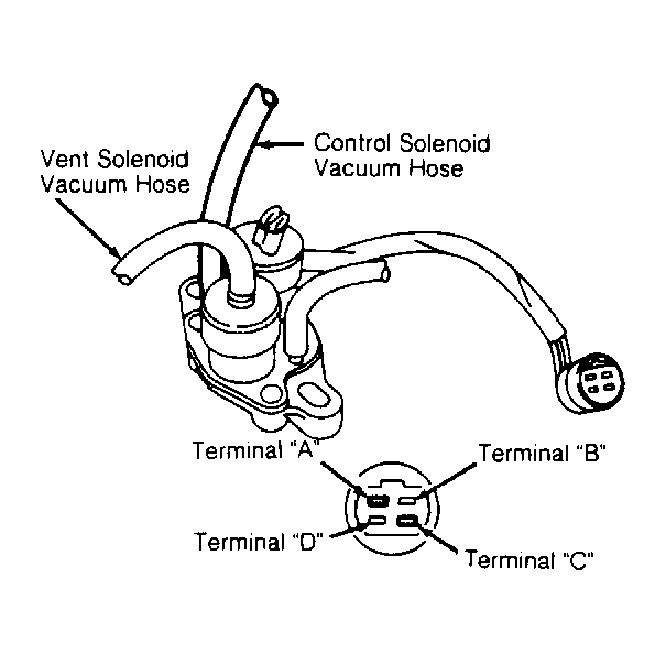 Disconnect vacuum and electrical connections from solenoid. Apply low air pressure to control solenoid vacuum hose, and ensure air pressure does not flow through solenoid. See Figure . Using jumper wire, connect terminal "C" to ground and apply 12 volts to terminal "A". Apply low air pressure to control solenoid vacuum hose, and ensure air pressure flows through solenoid. Replace solenoid if it does not operate as specified.