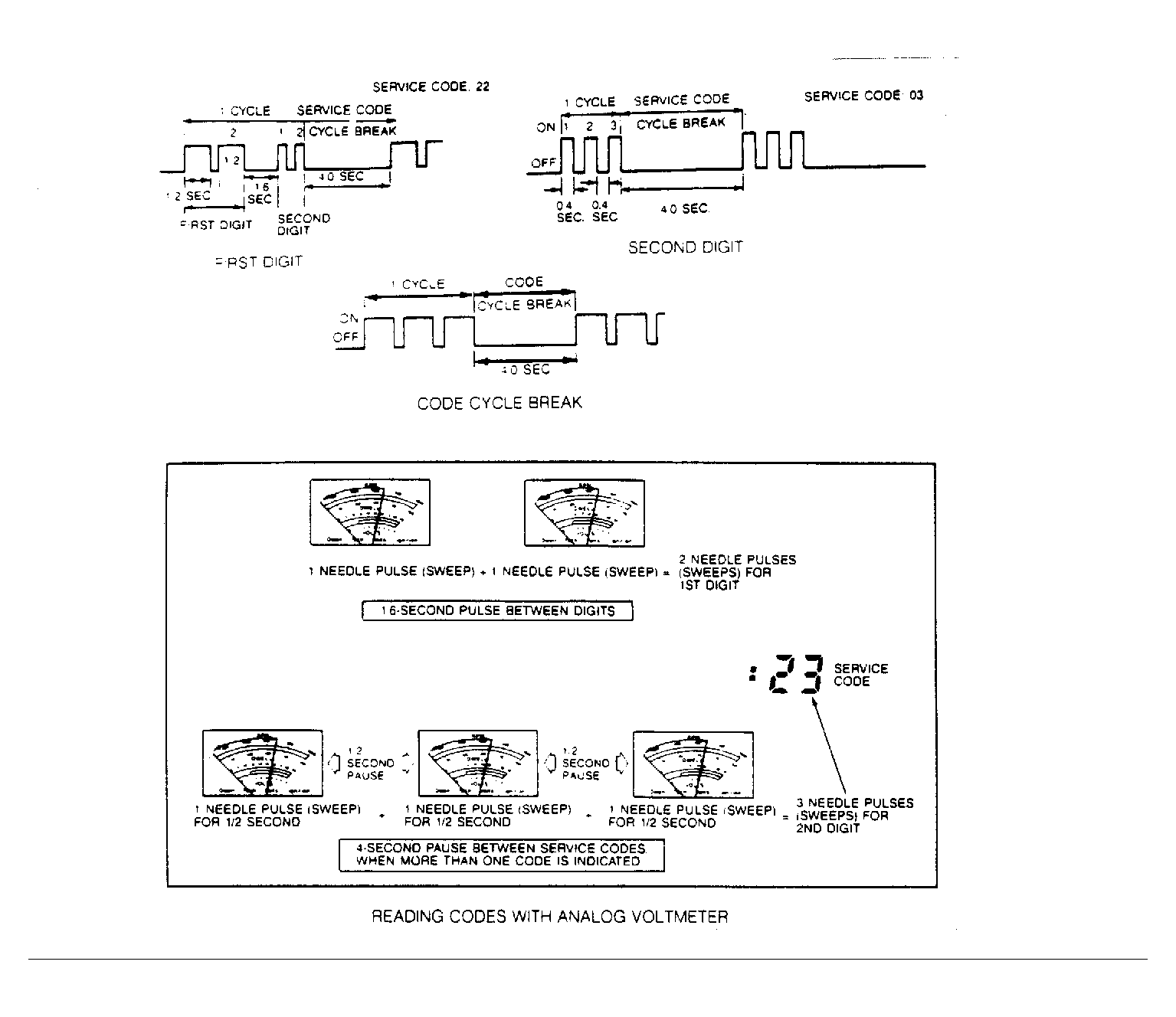8)  Start engine and allow to idle. Ensure VOM is connected as described in step 2). Record all codes displayed and repair fault as necessary. Refer to CODE REFERENCE CHART  to determine the correct CIRCUIT TEST. If no code is present, go to ANALOG VOLT-OHMMETER (VOM) under SWITCH MONITOR TEST  .