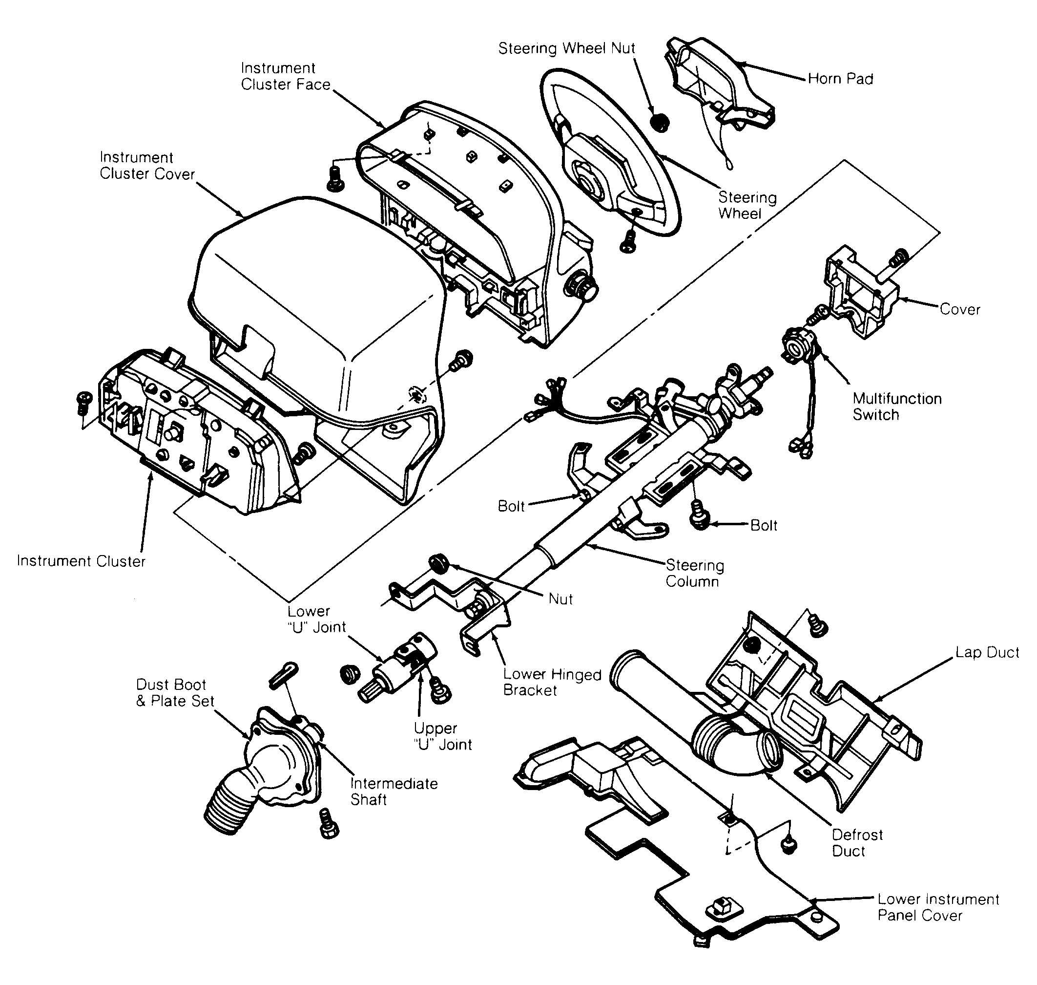 - Remove lower cover at knee level of instrument panel. Remove lap duct and defrost duct. Disconnect electrical connectors from turn-signal switch. Remove cinch bolt from upper "U" joint at lower end of steering shaft. Remove 2 mounting nuts from lower hinged bracket. Remove 4 cluster support nuts.