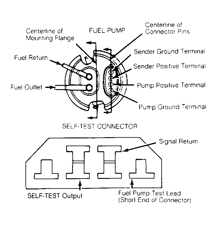 Release fuel pressure. Install fuel pressure gauge. Fuel pump may be activated by grounding the fuel pump lead at the SELF-TEST connector. Using a jumper lead, ground the "FP" terminal with the ignition on. This activates the fuel pump. See Fig 1 . For additional circuit test information, see appropriate TESTS W/CODES article in this section.