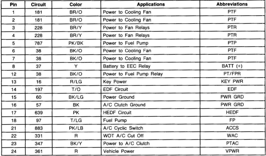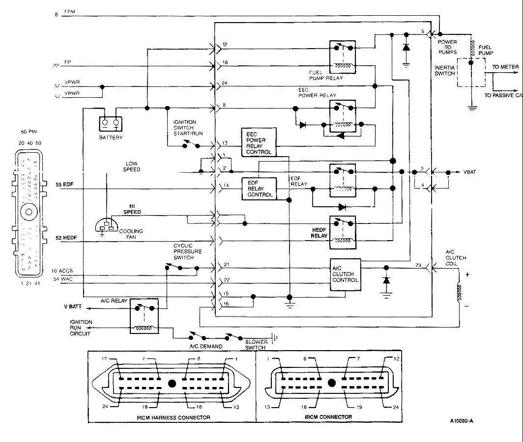 The Integral Relay Control Module (IRCM) interfaces with the EEC-IV processor to provide control of the cooling fan, A/C clutch, and the fuel pump.