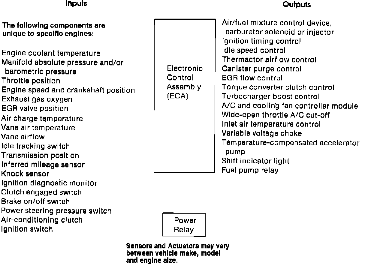 The Electronic Control Assembly (ECA) processes the input data from these sensors and produces output control signals to the fuel injectors, regulating precise fuel discharge through the injector nozzles. The microcomputer circuit also produces output signals that adjust ignition spark timing to provide the best balance between driveability and fuel economy.