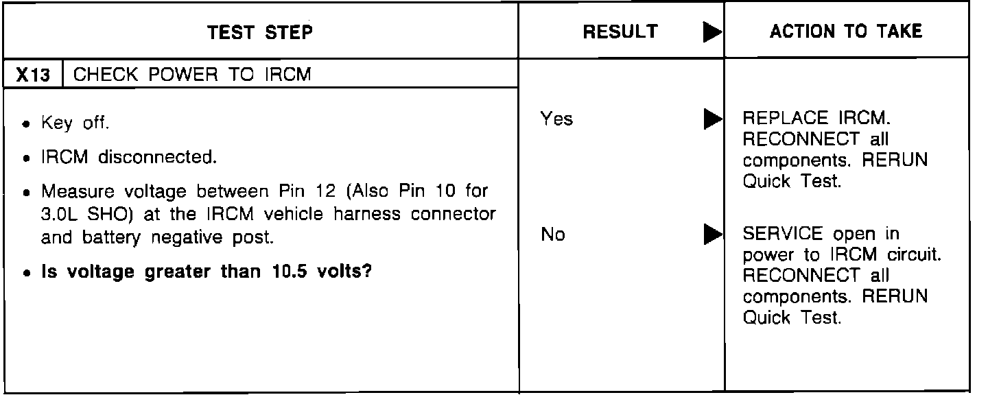 Home >> Ford >> 1991 >> Probe V6-182 3.0L >> Repair and Diagnosis >> Powertrain Management >> Computers and Control Systems >> Testing and Inspection >> Pinpoint Tests >> X - Integrated Relay Control Module >> X13 - Check Power to IRCM