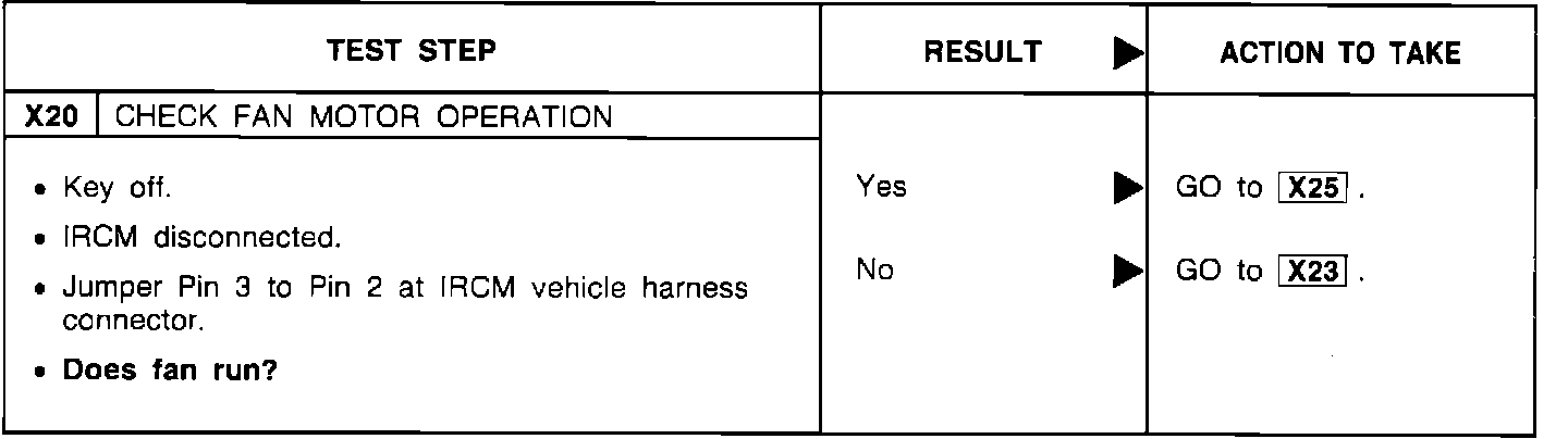 Home >> Ford >> 1991 >> Probe V6-182 3.0L >> Repair and Diagnosis >> Powertrain Management >> Computers and Control Systems >> Testing and Inspection >> Pinpoint Tests >> X - Integrated Relay Control Module >> X20 - Check Fan Motor Operation