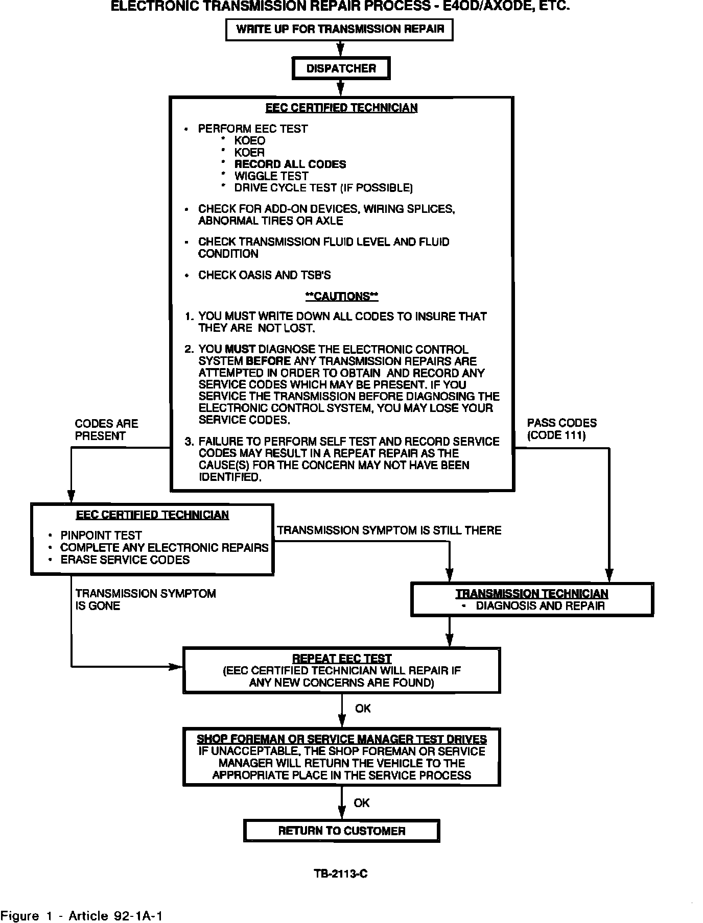 ACTION: Use the Electronic Transmission Repair Process Chart, Figure 1, to assist you in developing a routing system for electronically controlled transmission repairs. Using this routing chart will help in determining the "root cause" for the concern and repeat repairs.