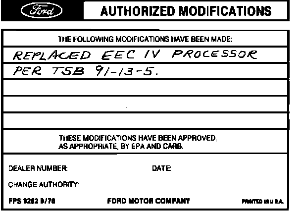 Obtain an Authorized Modifications Decal and list the date, dealer number, and summary of alterations performed. Select a prominent place adjacent to the Vehicle Emission Control Information Decal suitable for installing the Authorized Modifications Decal. Clean the area, install the decal, and cover it with a clear plastic decal shield.