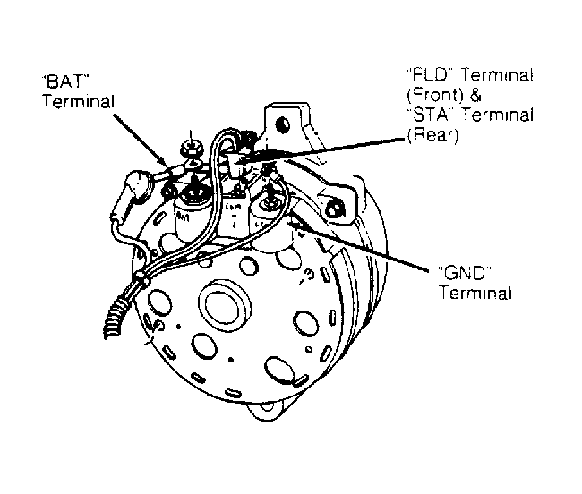Set ohmmeter on "x1" scale. Contact one probe to alternator FLD terminal and connect other probe to GND terminal. See Figure . Spin alternator pulley. Ohmmeter should read between 2.4-100 ohms and should fluctuate while pulley is spinning. An infinite reading indicates grounded brush lead, worn or stuck brushes or bad rotor assembly. A reading of less than 2.4 ohms indicates grounded brush assembly, grounded field terminal or a bad rotor.