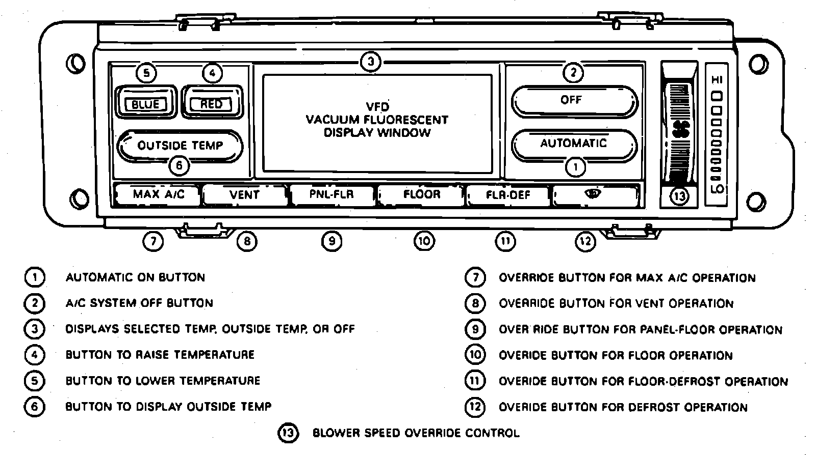 The temperature control assembly, Fig. 2, located on the instrument panel, consists of ten push buttons, a variable blower speed knob for manual input and a vacuum fluorescent display (VFD) for displaying ambient temperature, set temperature and diagnostic codes.