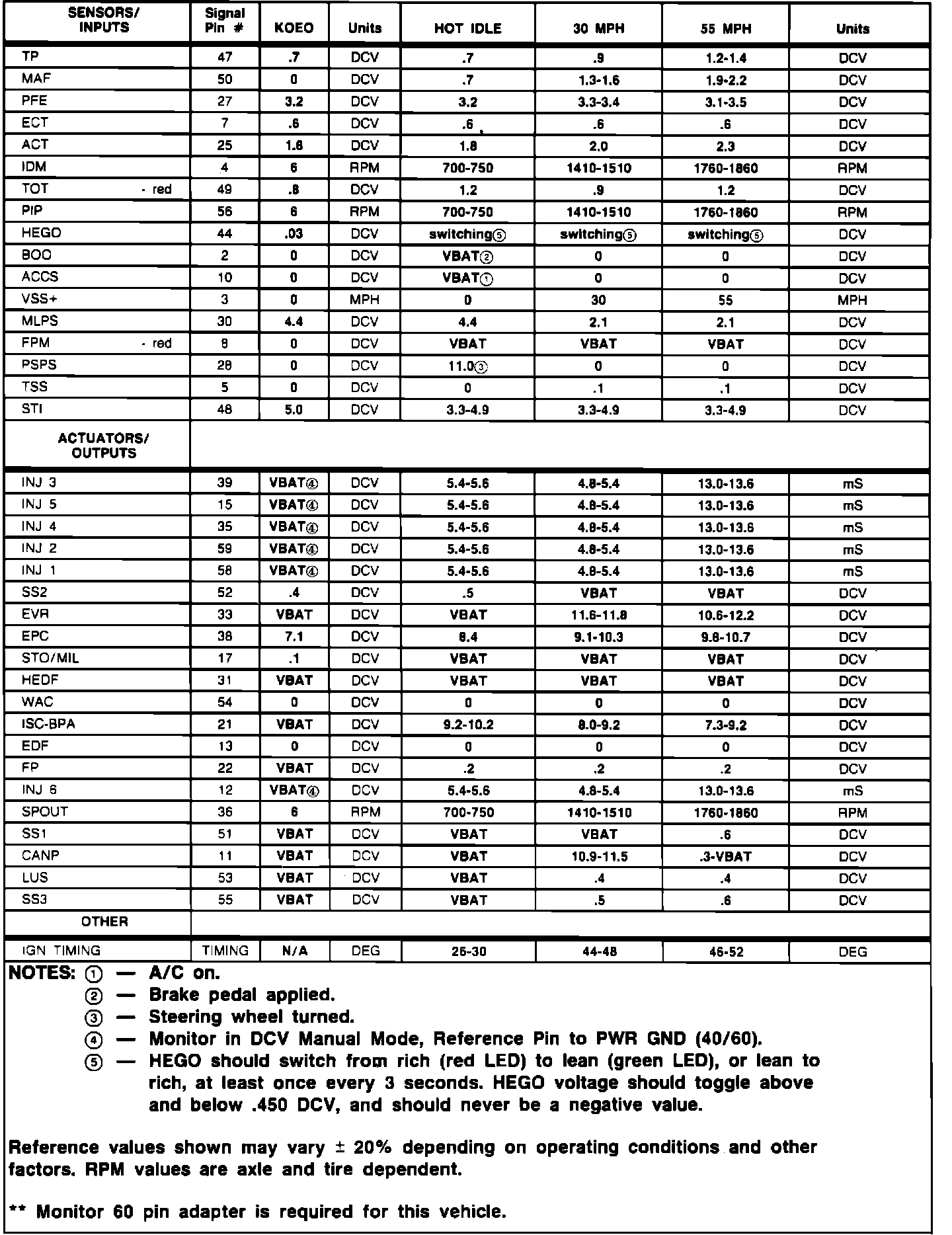 5. Reference values shown in the charts may differ between vehicles due to component tolerances, driving conditions, weather, etc. These values were recorded at approximately 600 feet above sea level and ambient temperatures ranging from 50 to 70 degrees Fahrenheit. Some EEC-IV devices are temperature dependent and their values may vary greatly. Other values are calibration dependent and may also vary.