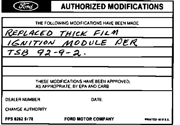 Obtain an Authorized Modifications Decal and list the date, dealer number, and summary of alterations performed. Select a prominent place adjacent to the Vehicle Emission Control Information Decal suitable for installing the Authorized Modifications Decal. Clean the area, install the decal, and cover it with a clear plastic decal shield.