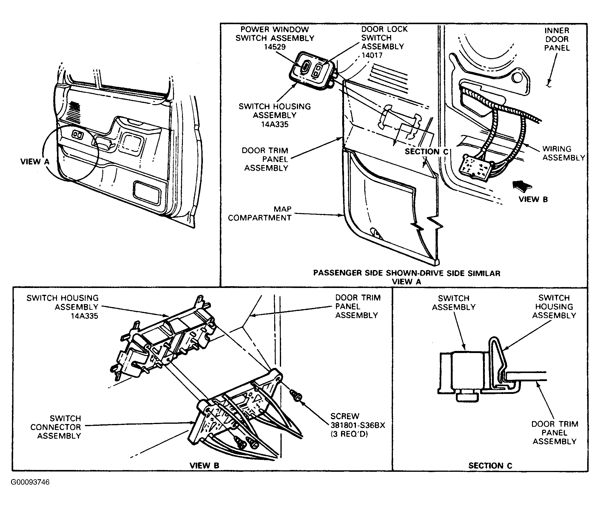 Position switch to connector and press firmly into place. Install connector to the switch housing using three attaching screws. Position switch housing to door trim panel and press firmly into place. See Fig 1 .