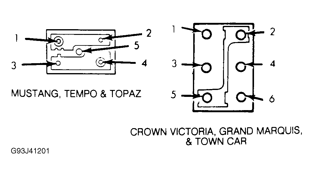 - With switch removed from vehicle, test with a self-powered test light or ohmmeter. With switch in NEUTRAL position, continuity should exist between terminals No. 1 and 3, 2 and 5, and 4 and 6. See Fig 2