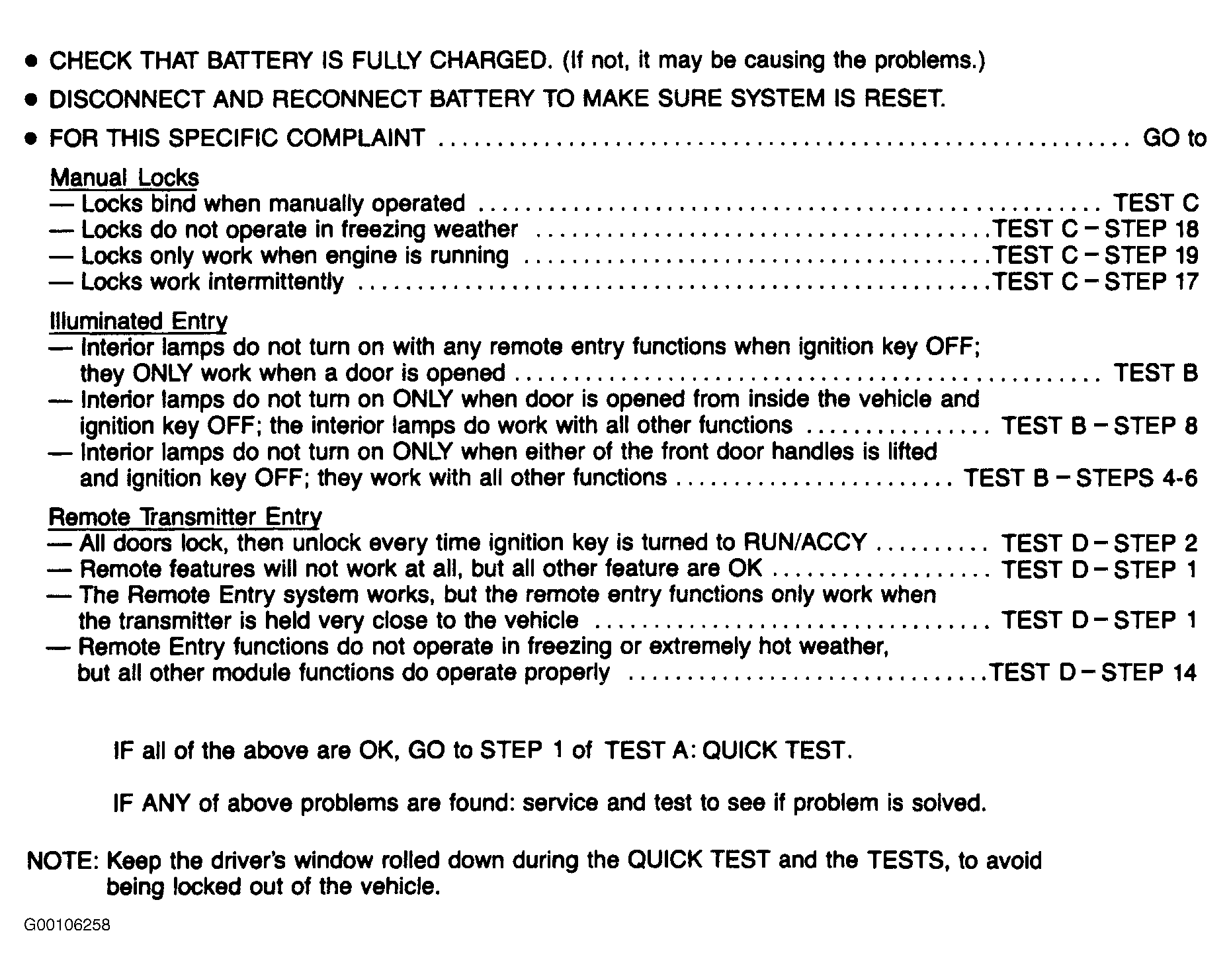 - Ensure the ignition switch OFF and that the RKE test connector is not shorted. Shut and lock all doors. Press the UNLOCK button on a transmitter. If the driver's door unlocks; interior lamps turn on; alarm does not sound when door is opened then go to next step. If driver's fails to unlock or interior lamps do not turn on then go to TEST D: REMOTE ENTRY SYSTEM . Perform repair as directed.