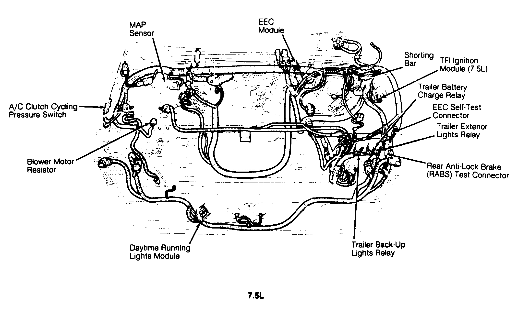 | 7.5L | On left side of firewall, near master cylinder. See Figure. | |