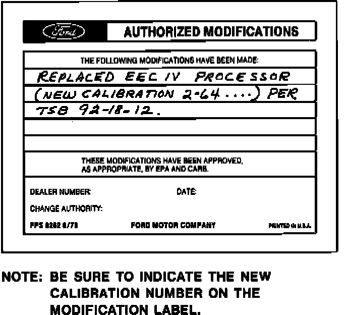 Obtain an Authorized Modifications Decal and list the date, dealer number, and summary of alterations performed. Select a prominent place adjacent to the Vehicle Emission Control Information Decal suitable for installing the Authorized Modifications Decal. Clean the area, install the decal, and cover it with a clear plastic decal shield.