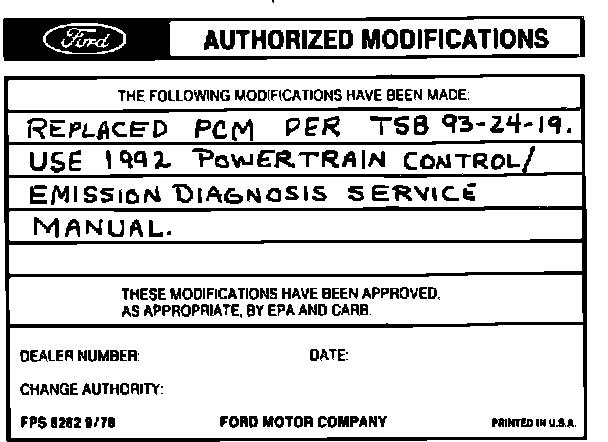 b. For 1991 models only, in addition to the standard entries on the Authorized Modifications Decal, write in the following instructions: "USE 1992 POWERTRAIN CONTROL/EMISSION DIAGNOSIS SERVICE MANUAL".