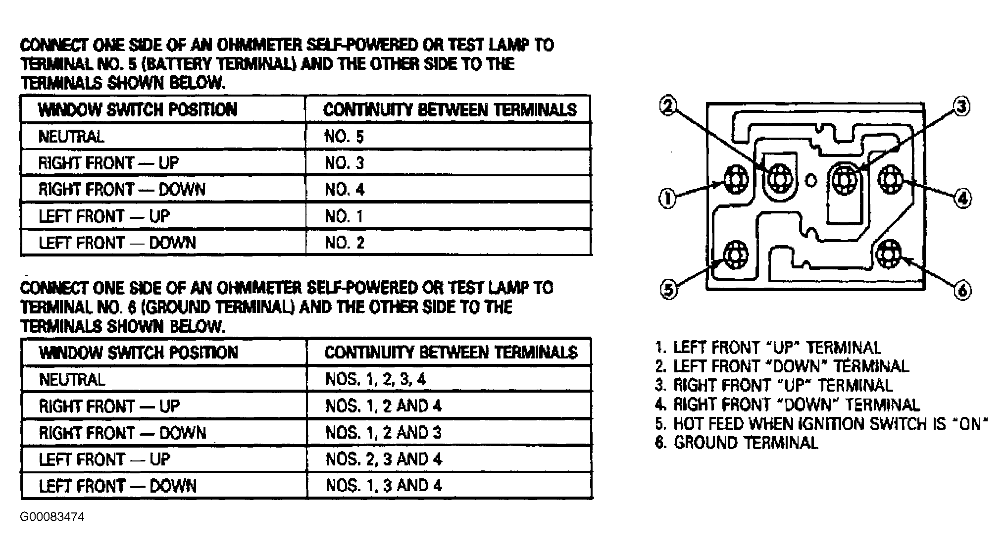4. Push both window switches downward (away from window when in installed position). Both terminals No. 2 and 4 should have no continuity to terminal No. 6. See Fig 1 . See WIRING DIAGRAMS  .