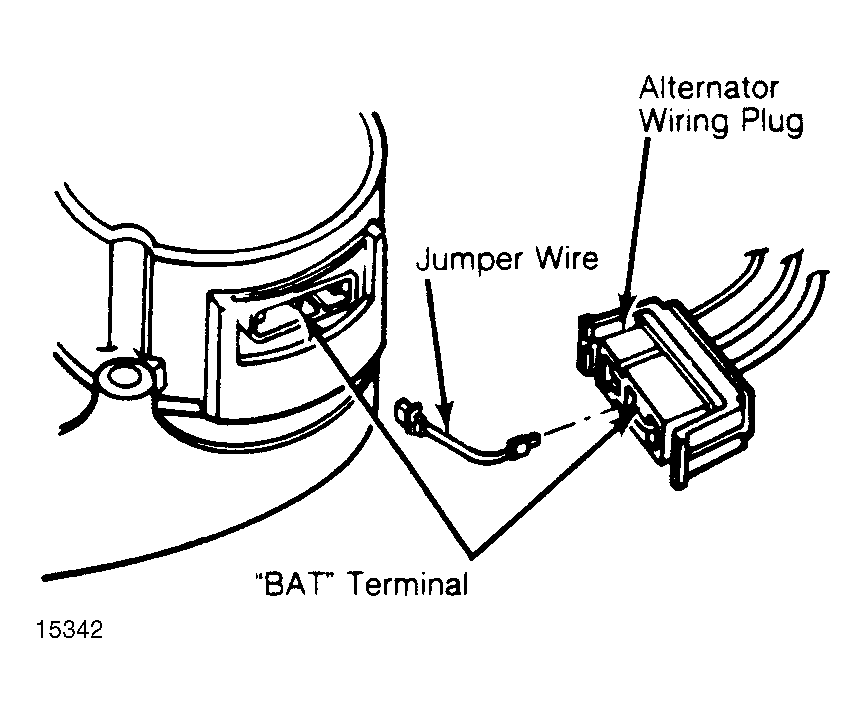 8. Unplug alternator wiring connector. Connect 12-gauge jumper wires between alternator "B+" terminals and mating connector terminals. See Fig 2. Connect voltmeter positive lead to "B+" terminal on alternator. Repeat step 3). If voltage increases to greater than .5 volt more than base voltage, repair wiring harness from alternator to starter relay. If increase is less than .5 volt, go to step 9).