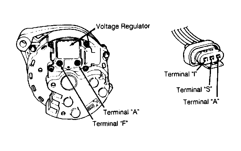 12. With ignition off, measure voltage at voltage regulator "A" and "F" terminals. If battery voltage does not exist at each terminal, repair or replace alternator. If battery voltage exists at each terminal, replace voltage regulator.