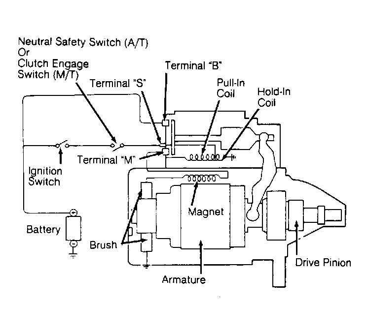Disconnect wiring and cables from solenoid. Using an ohmmeter, check for continuity between terminal "M" and body of starter solenoid. See Figure. Continuity should exist. If continuity does not exist, replace solenoid.