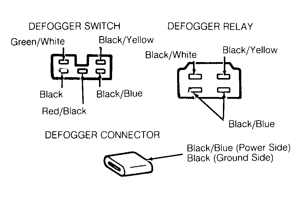 - Turn ignition off. Connect a jumper wire between Black/White wire on relay connector and corresponding terminal on relay. Connect a jumper wire between Black/Yellow wire on relay connector and corresponding terminal on relay. Turn ignition on. Ground Black/Blue wire at rear window relay.