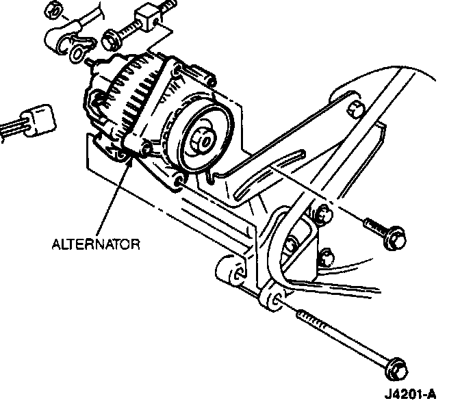 5. Remove the alternator adjustment bracket, lock bolt and the through bolt.