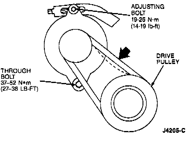 Tighten the through bolt to 37-52 Nm (27-38 lb-ft) and the alternator adjusting bracket bolt to 19-25 Nm (14-19 lb-ft).
