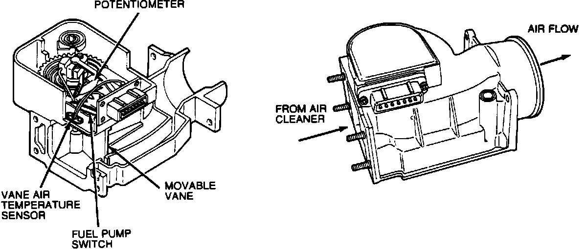 The VAF meter contains a potentiometer connected to a movable vane. Inside the VAF meter is a fuel pump switch providing a ground for the fuel pump circuit after the engine has started. The meter also contains a vane air temperature (VAT) sensor which monitors and relays inlet air temperature to the ECA.