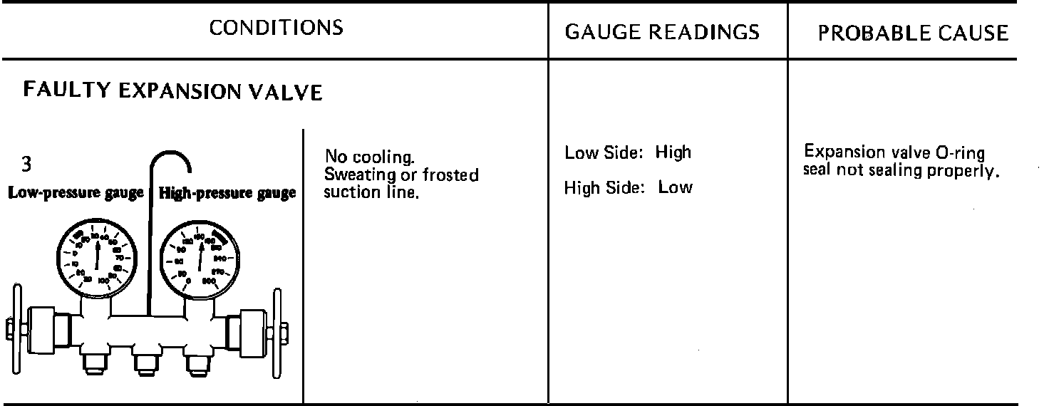 Due to the different types of models and systems the typical pressure gauge indications shown in this section should be used as a guide only. Refer to "Diagnosis and Testing Procedures", "System Diagnosis and Performance Test" for the particular model being tested. When indications other than normal are encountered, these typical indication charts will assist in diagnosing the refrigerant system. It should be noted that pressures may vary slightly above or below due to changes in ambient temperature and relative humidity.