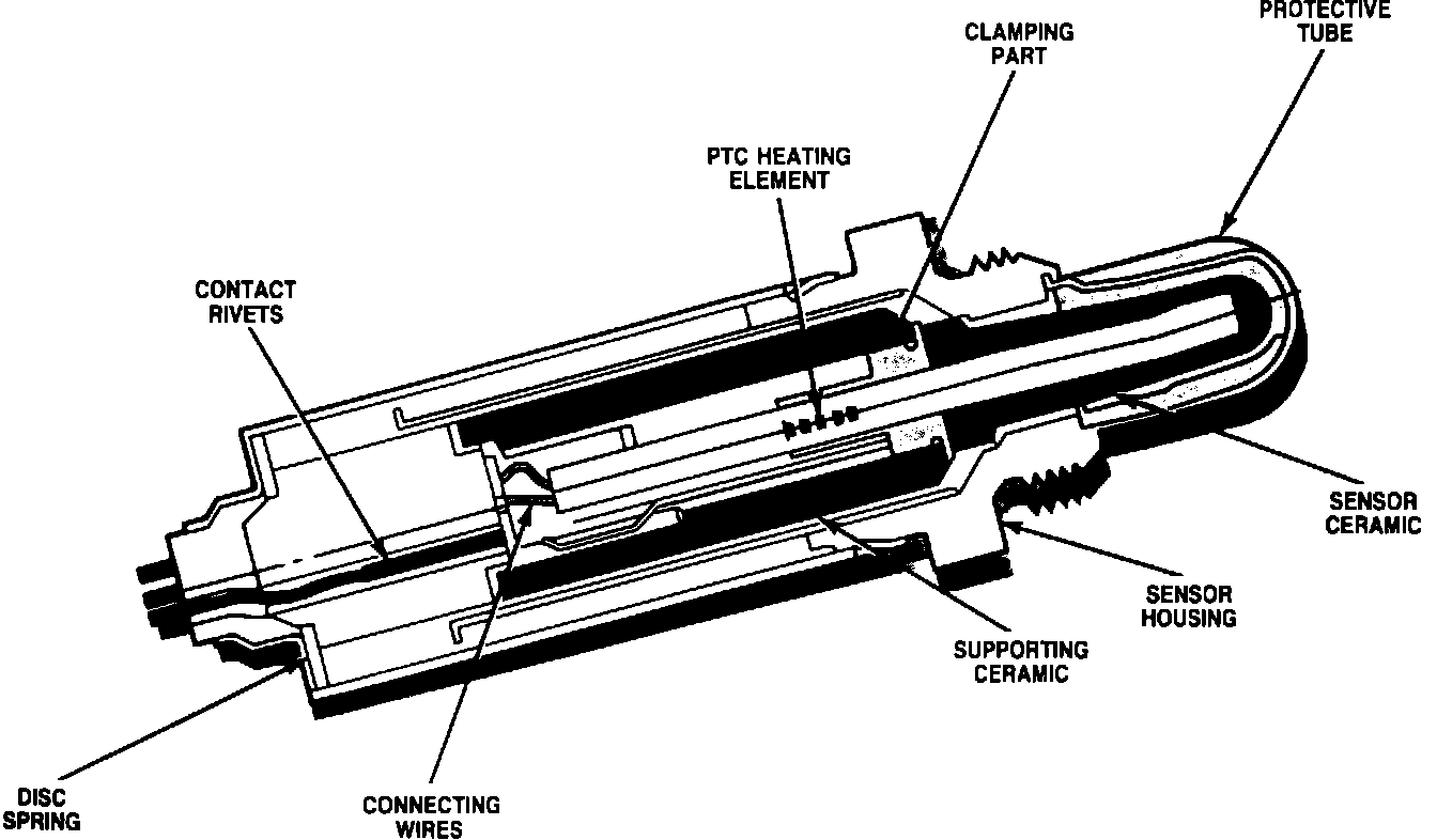 The sensor is a zirconium dioxide ceramic thimble with platinum surface electrodes. The ceramic thimble is oxygen ion conductive and generates voltage due to the oxygen content difference between the atmosphere and the exhaust gas. The sensor will generate a voltage signal between 0 volts (lean condition) and 1.1 volts (rich condition). The Electronic Control Assembly (ECA) reads this signal to achieve an air/fuel ratio of 14.7:1 when operating in CLOSED LOOP.