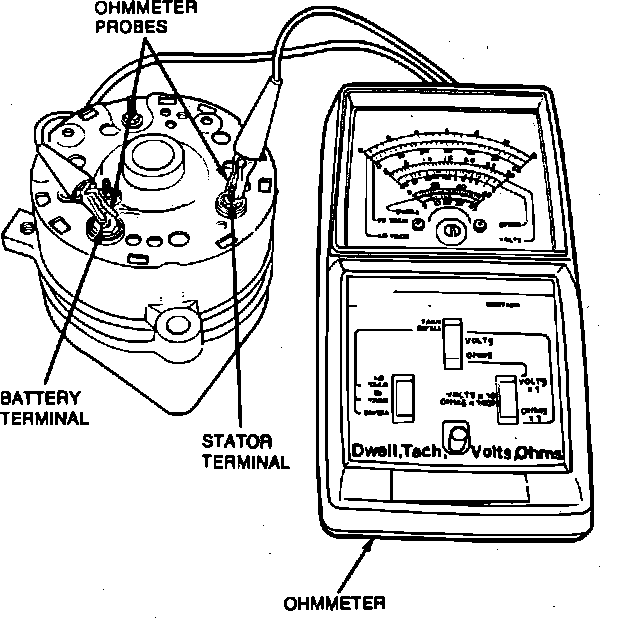Perform the same test using the STA and GND (ground) terminals of the alternator. A reading in both directions indicates either a bad negative diode, a grounded stator winding, a grounded stator terminal, a grounded positive diode plate, or a shorted radio capacitor, if equipped.