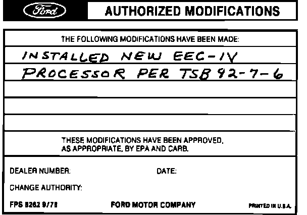 Obtain an Authorized Modifications Decal and list the date, dealer number, and summary of alterations performed. Select a prominent place adjacent to the Vehicle Emission Control Information Decal suitable for installing the Authorized Modifications Decal. Clean the area, install the decal, and cover it with a clear plastic decal shield.