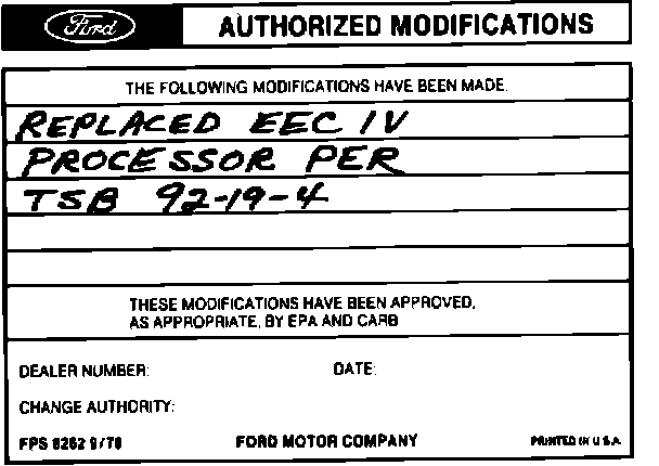 Obtain an Authorized Modifications Decal and list the date, dealer number, and summary of alterations performed. Select a prominent place adjacent to the Vehicle Emission Control Information Decal suitable for installing the Authorized Modifications Decal. Clean the area, install the decal, and cover it with a clear plastic decal shield.