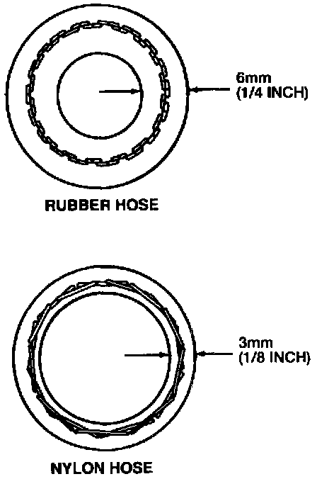 7. Determine the type of suction hose with which you are working. To do this, cut the suction hose into two pieces (make the cut closer to the compressor than the accumulator) and measure the hose wall thickness. Rubber lined hose has a wall thickness of 1/4 inch and nylon lined hose has a wall thickness of 1/8 inch.
