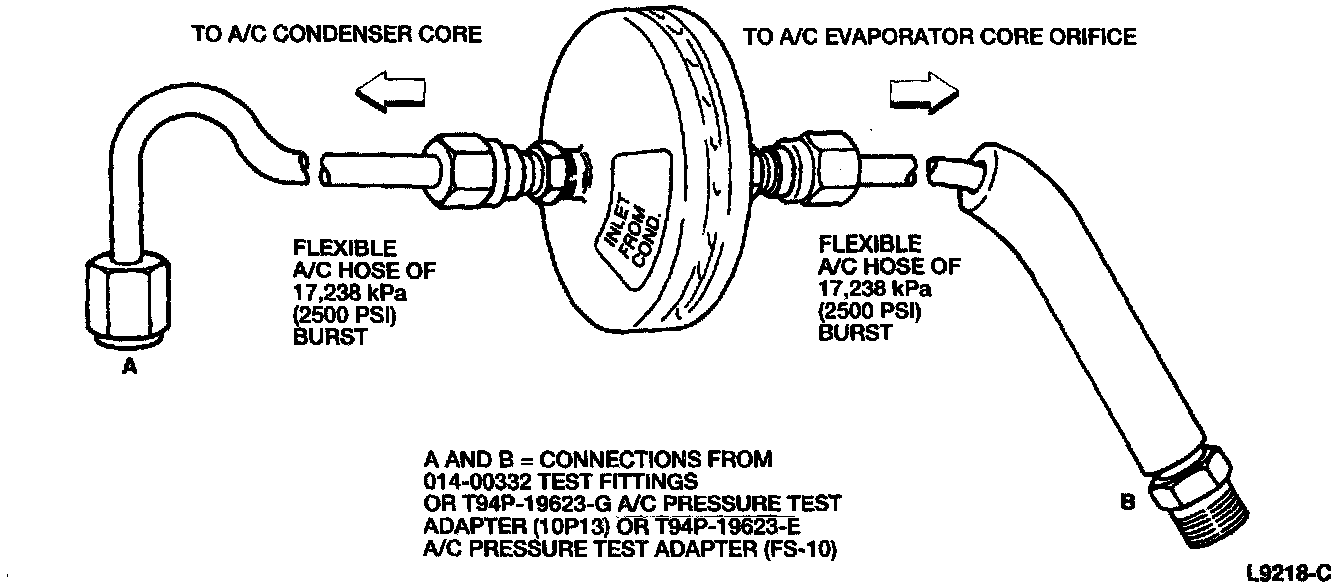11. Install a pancake filter in the liquid line between the condenser and the orifice tube. Be sure the filter inlet is toward the condenser. Connections can be made using the A/C Test Fitting Set D88P-19703-B or equivalent and a flexible refrigerant hose of 2500 psi burst rating. Individual fittings are also available.