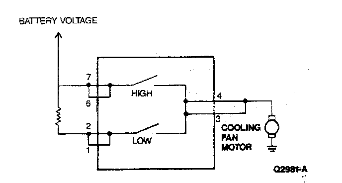 The Low Fan Control (LFC) relay controls the electric cooling fan. The primary control circuit of the LFC relay is normally high (B+). In this state the low speed cooling fan runs continuously. The PCM grounds this circuit, pulling it low near zero volts, to turn the fan off. This "fail safe" is built into the fan control circuit to run the fan anytime the EEC power relay is activated if the PCM should fail open circuit.