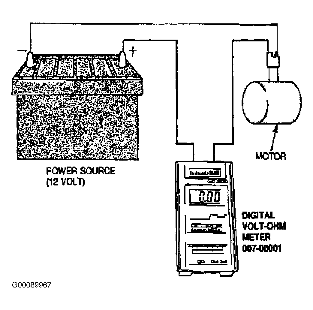 - Operate the motor and observe the current draw. The current draw for the no-load test should not exceed specification and should not fluctuate. Reversal of the motor wire connections will reverse the direction of motor rotation. Replace the motor if the current draw exceeds 5 amps at 12.8 volts