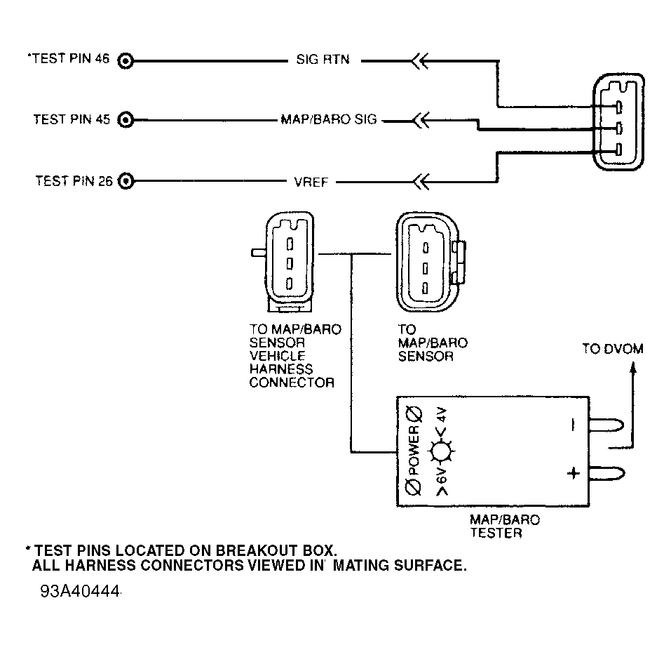 4) Check MAP/BARO Frequency Turn ignition off. Connect MAP/BARO tester to MAP/BARO sensor. See Figure in CIRCUIT TEST DF. Turn ignition on. If MAP/BARO voltage is within specification, go to step 5) (MAP/BARO equipped vehicles) or step 6) (all other vehicles). See MAP SENSOR VOLTAGE OUTPUT table. If voltage is not within specification, check wiring to MAP/BARO sensor for corrosion and other damage. Repair as necessary. Clear KAM, and repeat QUICK TEST. If wiring is okay, replace MAP/BARO sensor. Clear KAM, and repeat QUICK TEST.