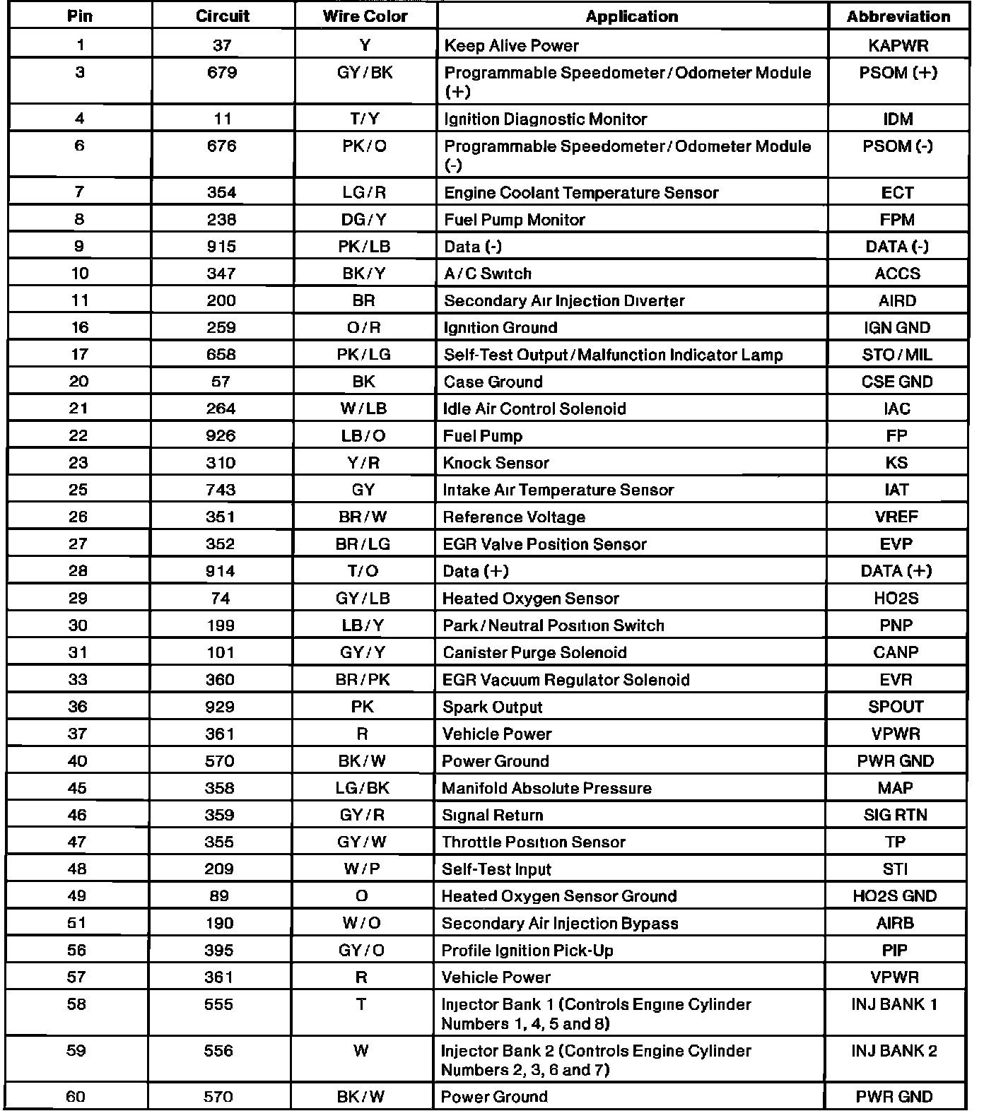 Powertrain Control Module (PCM) Connector Pin Useage:
