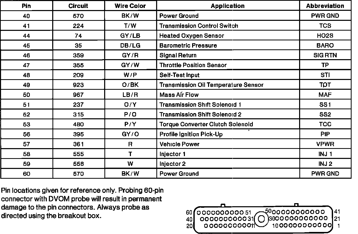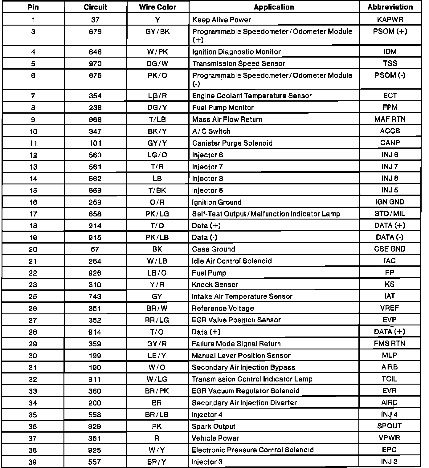 Powertrain Control Module (PCM) Connector Pin Useage:
