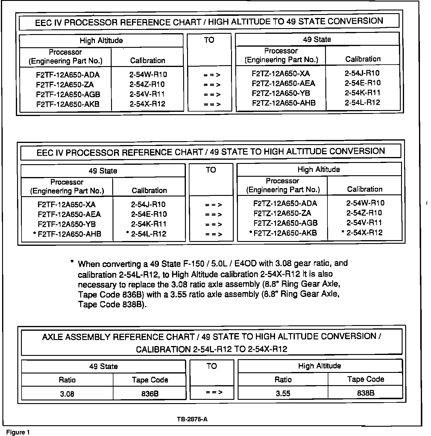 1. If it is necessary to change the calibration in one of subject vehicles, between 49 State and High Altitude, refer to the appropriate EEC IV Processor Conversion Chart shown in Figure 1.