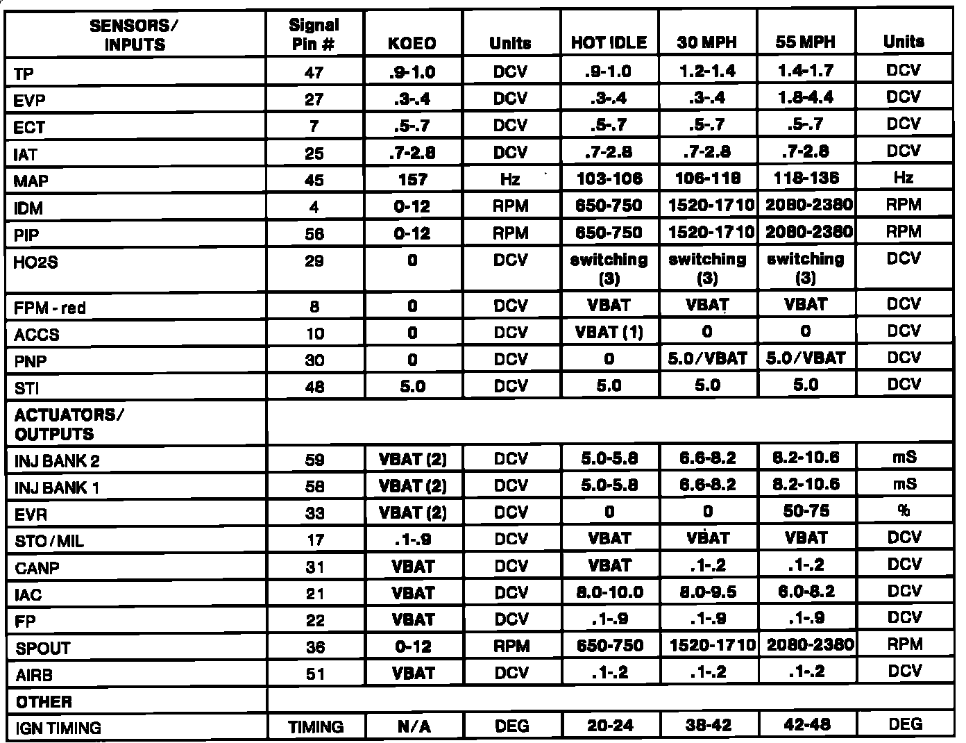 (3) -- HO2S should switch from rich (red LED) to lean (green LED), or lean to rich, at least once every 3 seconds. HO2S voltage should toggle above and below .450 DCV and should never be a negative value.