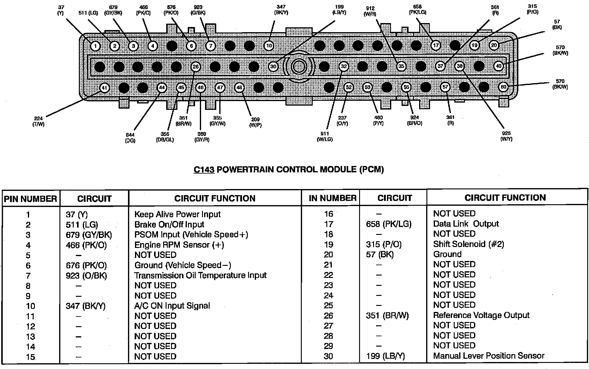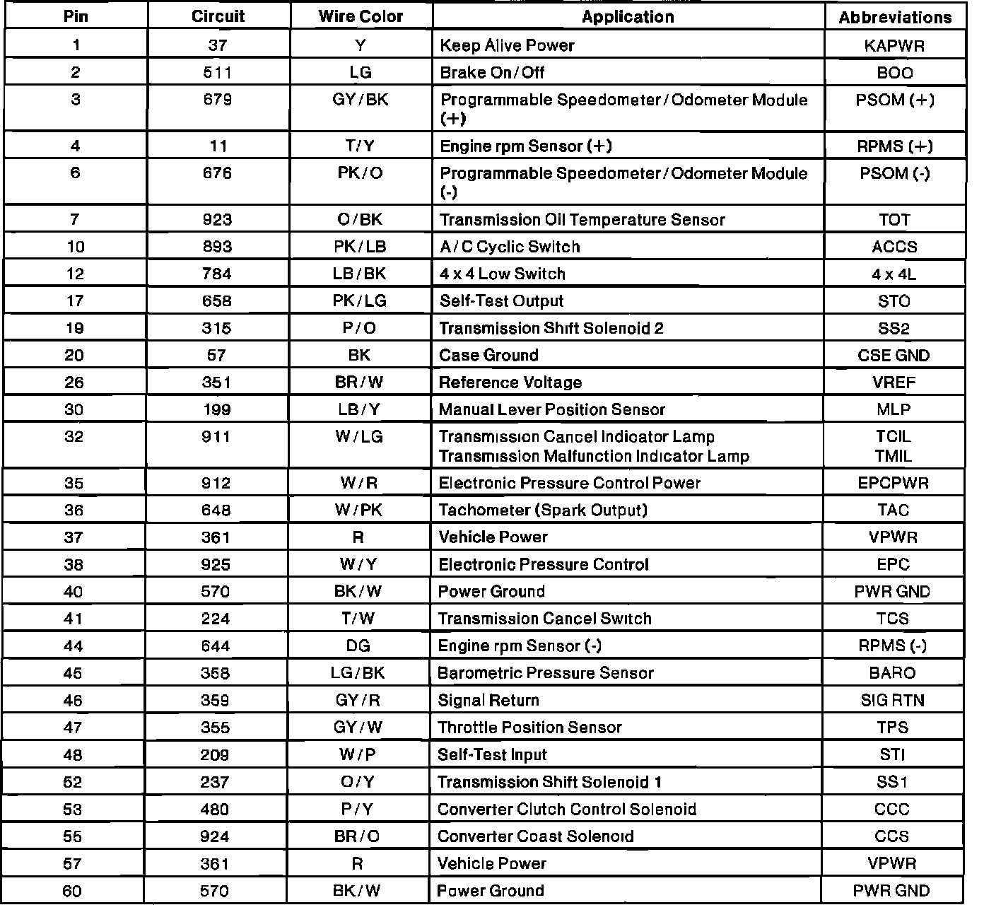 Powertrain Control Module (PCM) Connector Pin Useage: