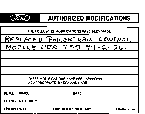 Obtain an Authorized Modifications Decal and list the date, dealer number, and summary of alterations performed. Select a prominent place adjacent to the Vehicle Emission Control Information Decal suitable for installing the Authorized Modifications Decal. Clean the area, install the decal, and cover it with a clear plastic decal shield.